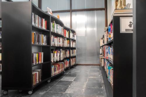 Bij de inrichting wordt met het grootste respect omgegaan met het historische karakter van het bestaande gebouw: ornamenten, bogen, vloeren en lambriseringen blijven behouden. De scheiding tussen de bibliotheek en de kerk wordt gevormd door een moderne interpretatie van de aanwezige glasramen. Meerwandige polycarbonaatplaten filteren het licht van de oorspronkelijke glas-in-loodramen op subtiele wijze. Het nieuwe houtwerk wordt uitgevoerd in dezelfde kleur als het bestaande houtsnijwerk, waardoor oud en nieuw harmonieus samenvloeien.
